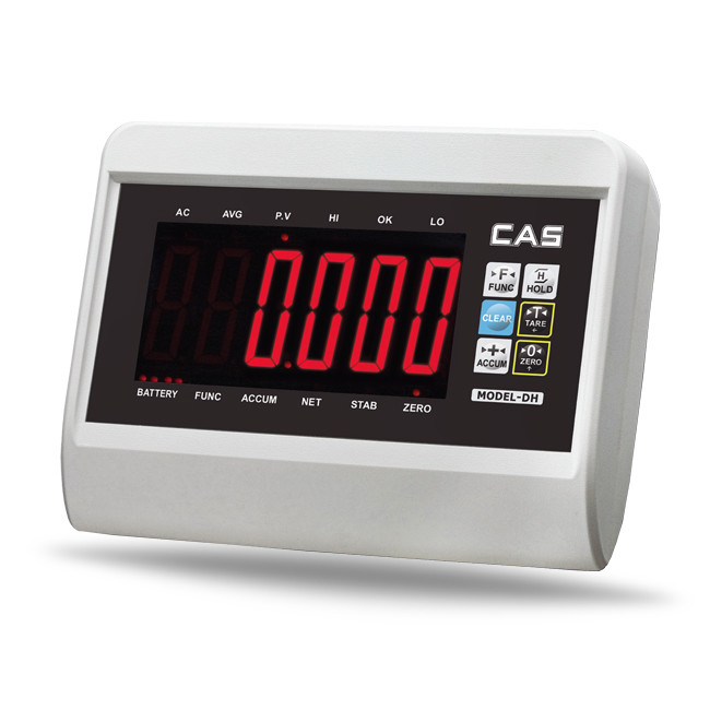 CAS-DH Weighing Indicator. With fast speed and high precision, A/D conversion technology, the DH Series is suitable for either a bench platform scale, floor scale or any static check-weighing system that is equipped with 1~4 load cells. With a built-in rechargeable battery, the DH Series can operate in environments where little or no power outlets are available.