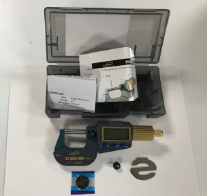 Clear, Extra Large LCD display, accurate to 0.00016”. Hardened and ground spindle with carbide anvil ensure durability and accuracy. Comes in a protective case with Ball Attachment, battery door opener, instructions, and extra battery.